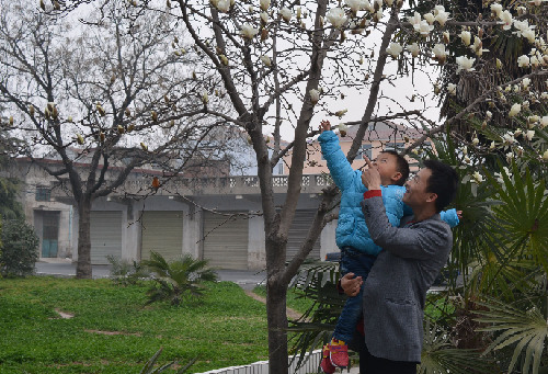 ????春風送暖,各種花次第開放,引得市民爭相品味醉人的春色。圖為昨日扶溝縣一對父子在觀賞盛開的木蘭花。扶溝縣大力開展生態林業建設,營造良好的人居環境。春天一到,鮮花斗艷,春草吐綠,處處春色醉人。(記者 王泉林 攝)