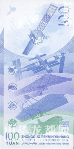 中國航天紀念鈔面額為100元,票面長155毫米,票面寬77毫米,中國航天紀念鈔主色調為藍色。正面主景圖案為神舟九號飛船與天宮一號交會對接圖案。左上方為國徽圖案、“中國人民銀行”行名,其下方為東方紅一號衛星圖案。票面左下方為面額數字“100”和漢字“壹佰圓”。主景圖案右側為嫦娥一號衛星圖案,其上方為面額數字“100”和“中國航天紀念”字樣。背面主景圖案由上至下依次為嫦娥一號衛星圖案、2020年中國空間站“天宮”、噴氣式客機、馮如2號雙翼螺旋槳飛機、飛禽海東青圖案。票面左上角為風箏局部圖案,右上角為面額數字“100”。票面下方為行長章與年號“2015”,中國人民銀行漢語拼音字母和蒙、藏、維、壯四種民族文字的“中國人民銀行”字樣與面額,面額數字“100”,漢語拼音字母“YUAN”。