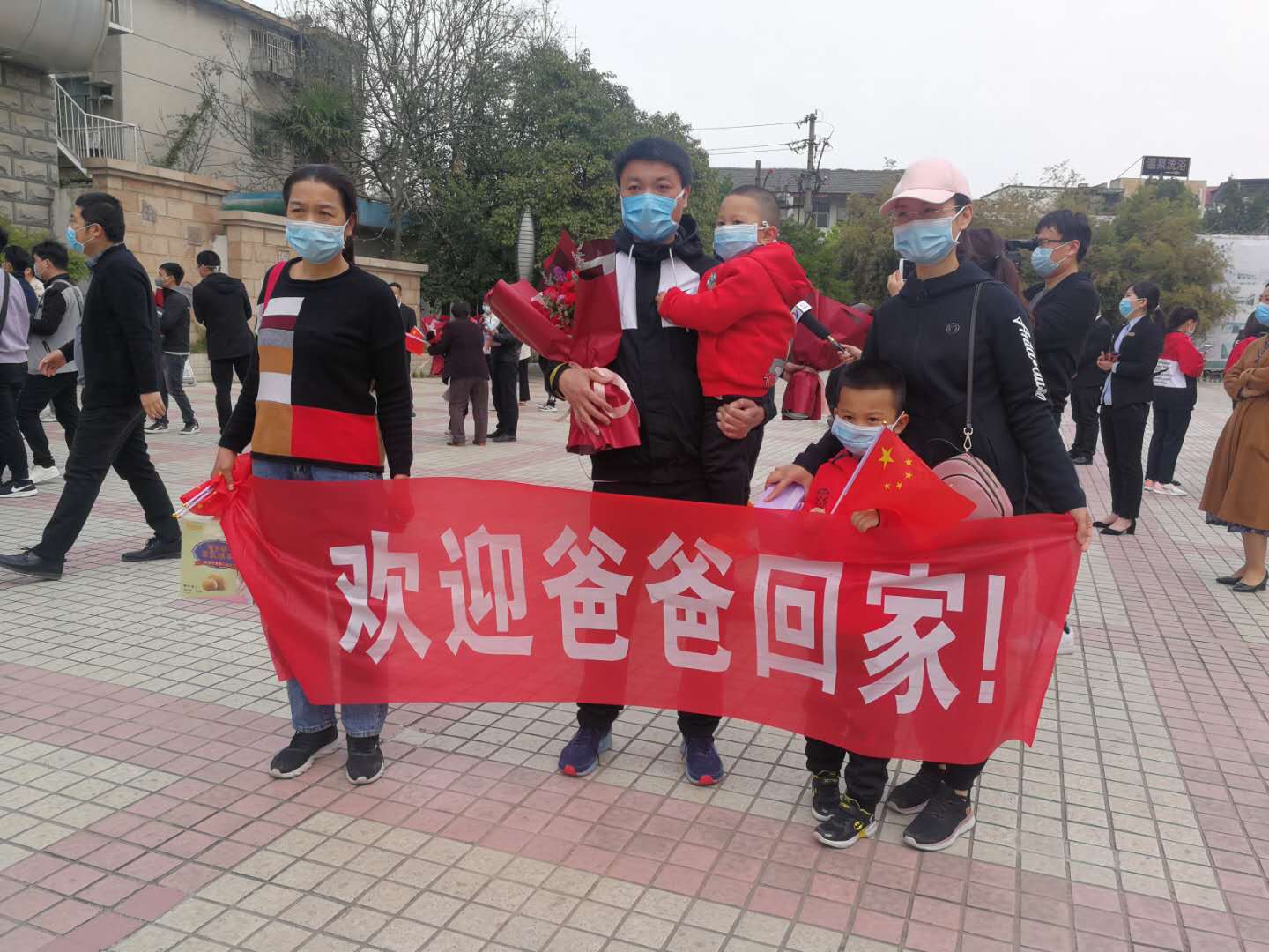 “歡迎爸爸回家”、“歡迎回家” 親人們、同事們、朋友們和自發趕來的市民早早守候在隔離休整點門口,等著迎接英雄回家。一束束鮮花、一條條橫幅都在向凱旋而來的勇士們表達著敬意和思念。