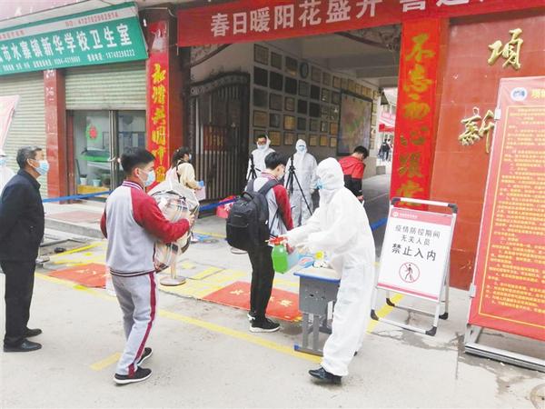 在周口十九中,記者看到,一大早,該校全體教職員工就已準備就緒,分別在校門口和教室內等候初三學子的到來。據了解,復學首日,該校安排了60余名教師在校門口維持秩序,此時的他們既是安全員又是防疫員。