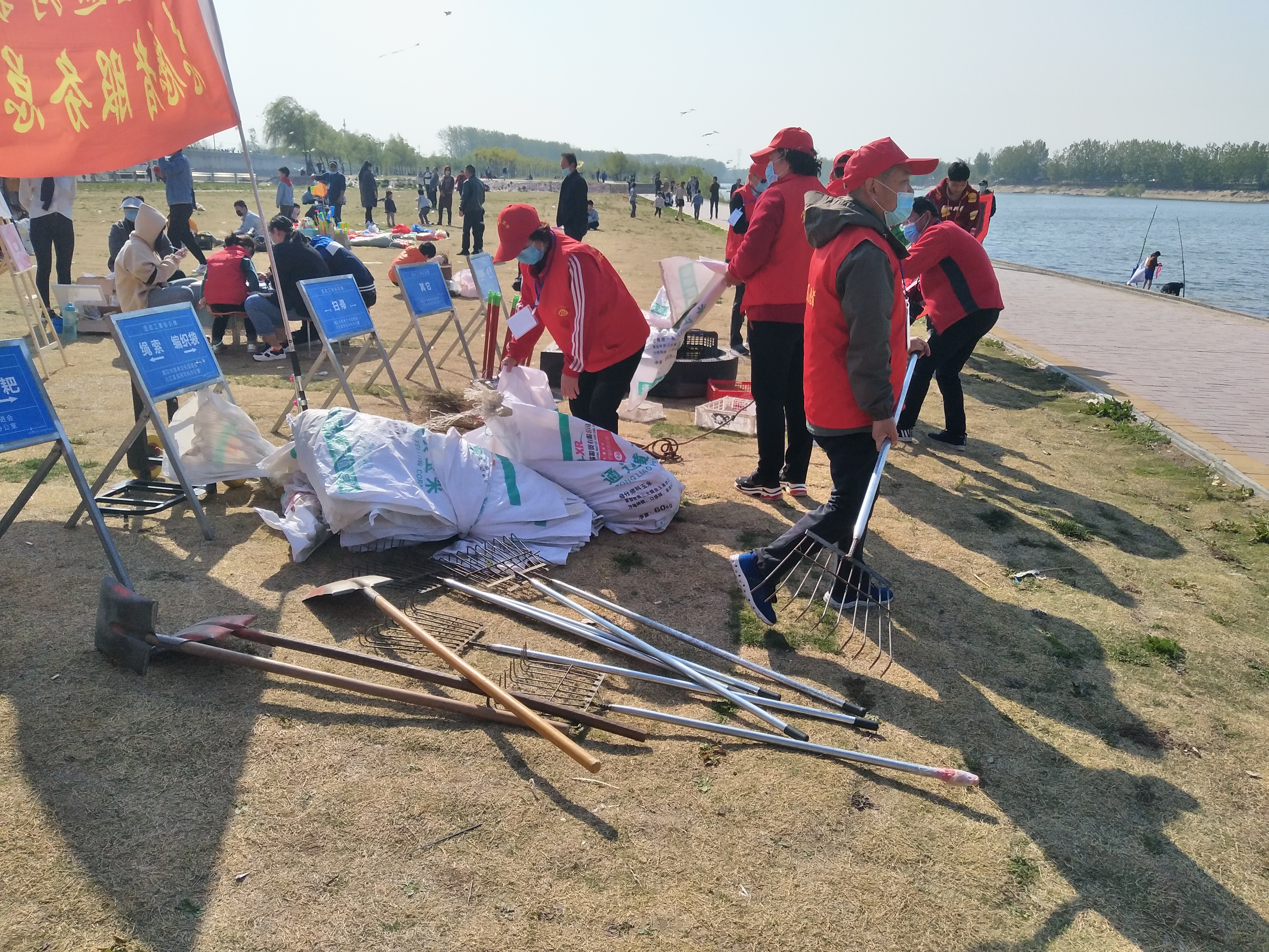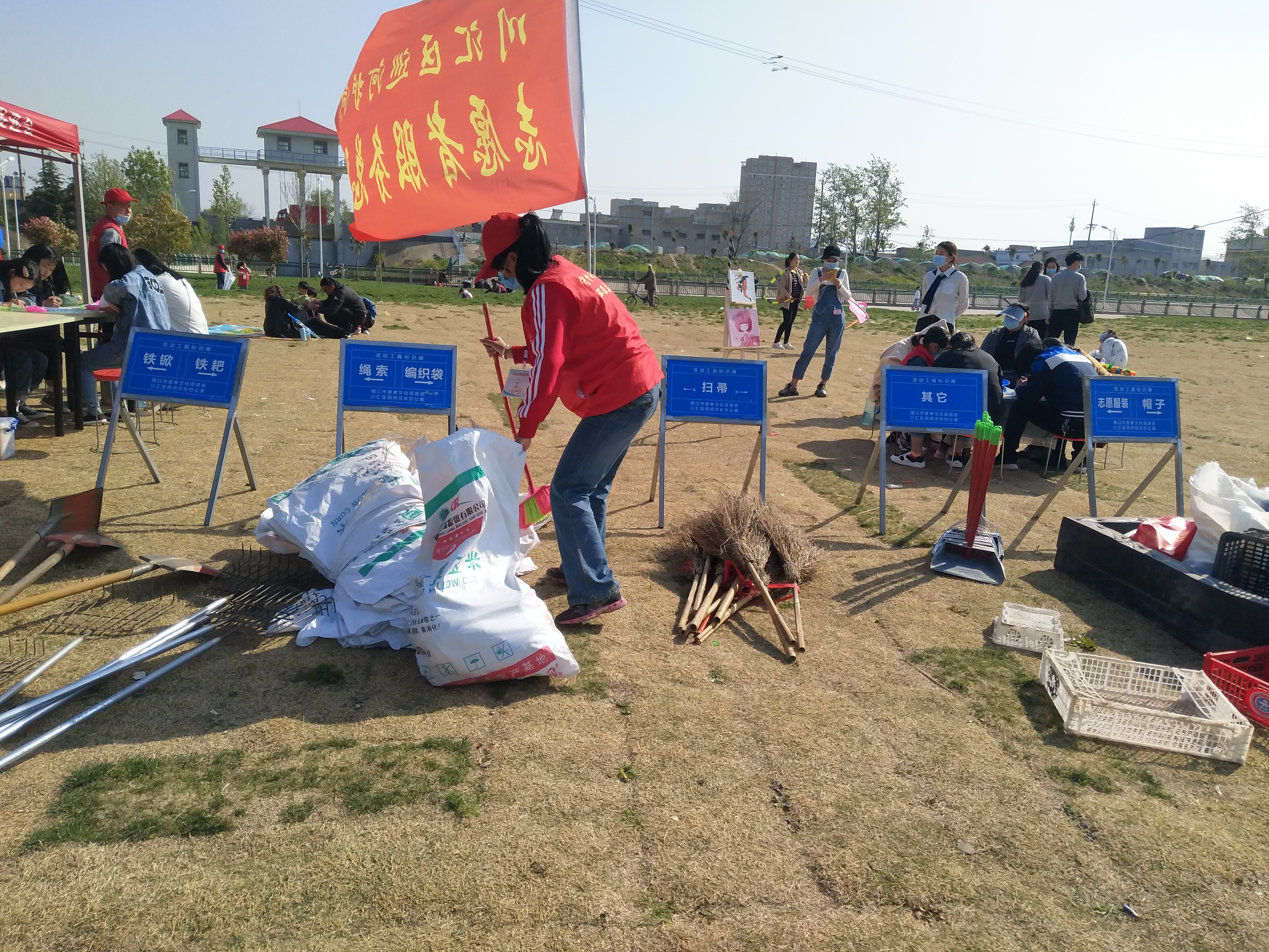 問卷棚旁是擺放整齊的河面垃圾清理工具,鐵锨、鐵耙、繩索、編織袋、掃帚、垃圾箱一字排開,寫有“川匯區巡河護河”、“志愿者服務總隊”字樣的紅旗迎風飛揚。記者向志愿者借了身衣服,和大家一起等著護河總指揮孫彩云分工。