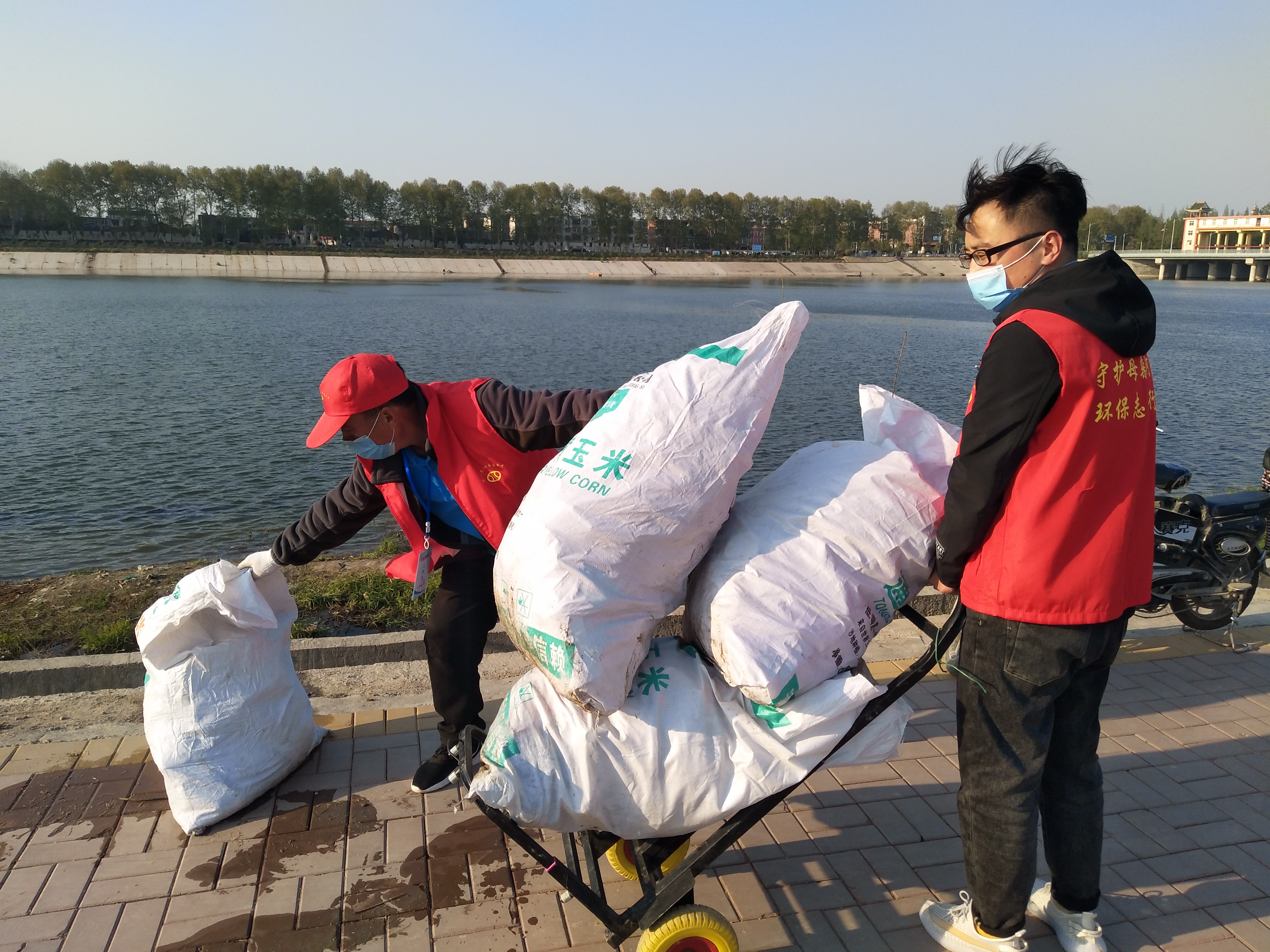 “哇!這回撈上來得多,快撿呀!”前方不遠處,一群志愿者歡呼著分揀剛撈上岸的一堆垃圾:塑料瓶,白色瓶蓋,玻璃瓶,包裝袋,化肥袋……志愿者們把他們逐一撿進身后的垃圾筐,拉上河堤,裝進白色大編織袋里。經過兩個多小時的忙碌,十余大編織袋垃圾被裝車運往垃圾站,慈孝文化促進會第55次護河行動順利結束。