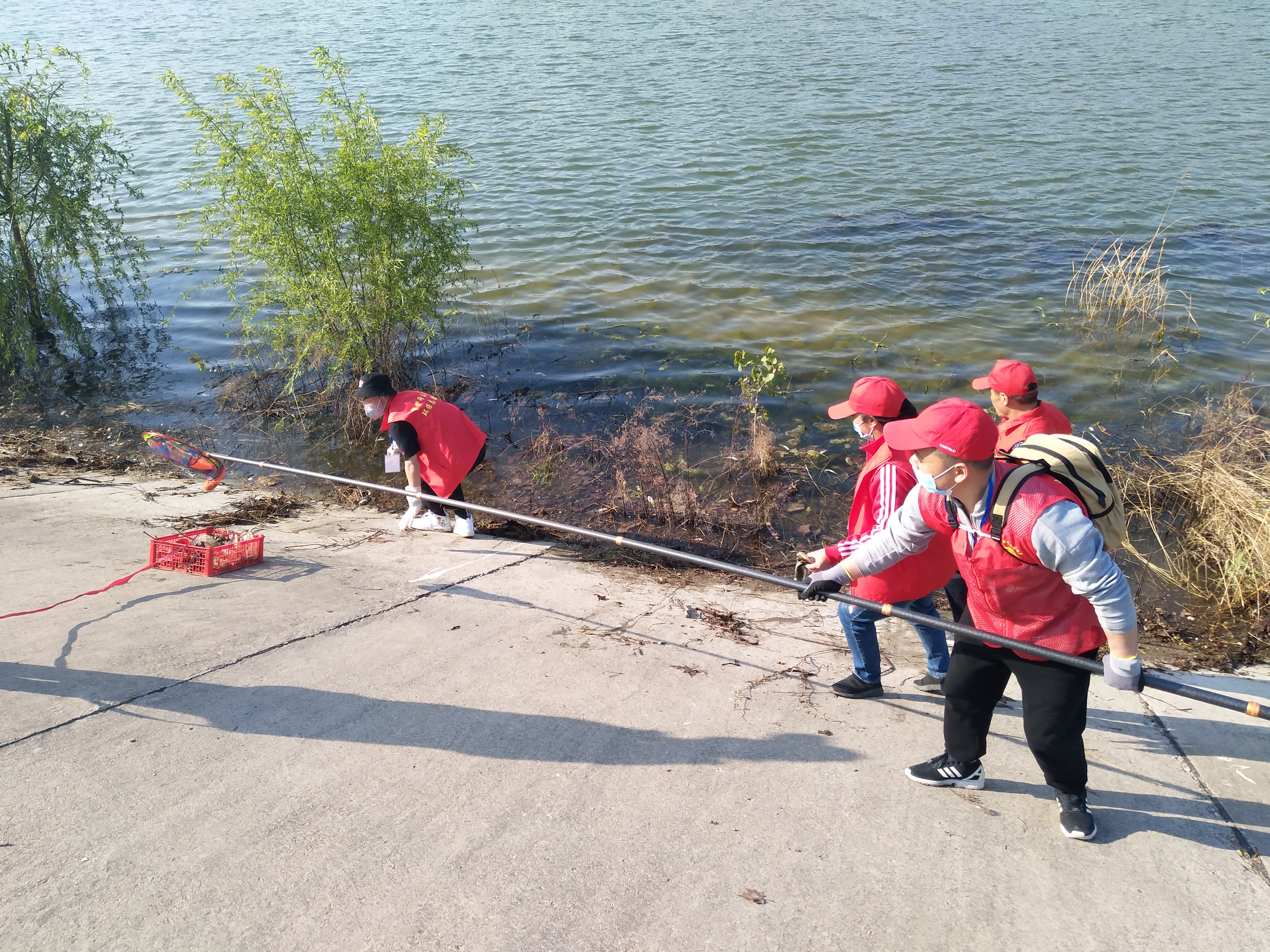 留下若干人員做問卷調查,孫彩云開始安排護河人員。誰拿鐵耙,誰拿網兜,誰拿垃圾箱,誰負責運垃圾袋……孫彩云一一分工后,拿起大喇叭給志愿者團隊提示注意事項:“只撿白色垃圾呀,不要鉤水草,這個季節魚在上面產卵呢!”