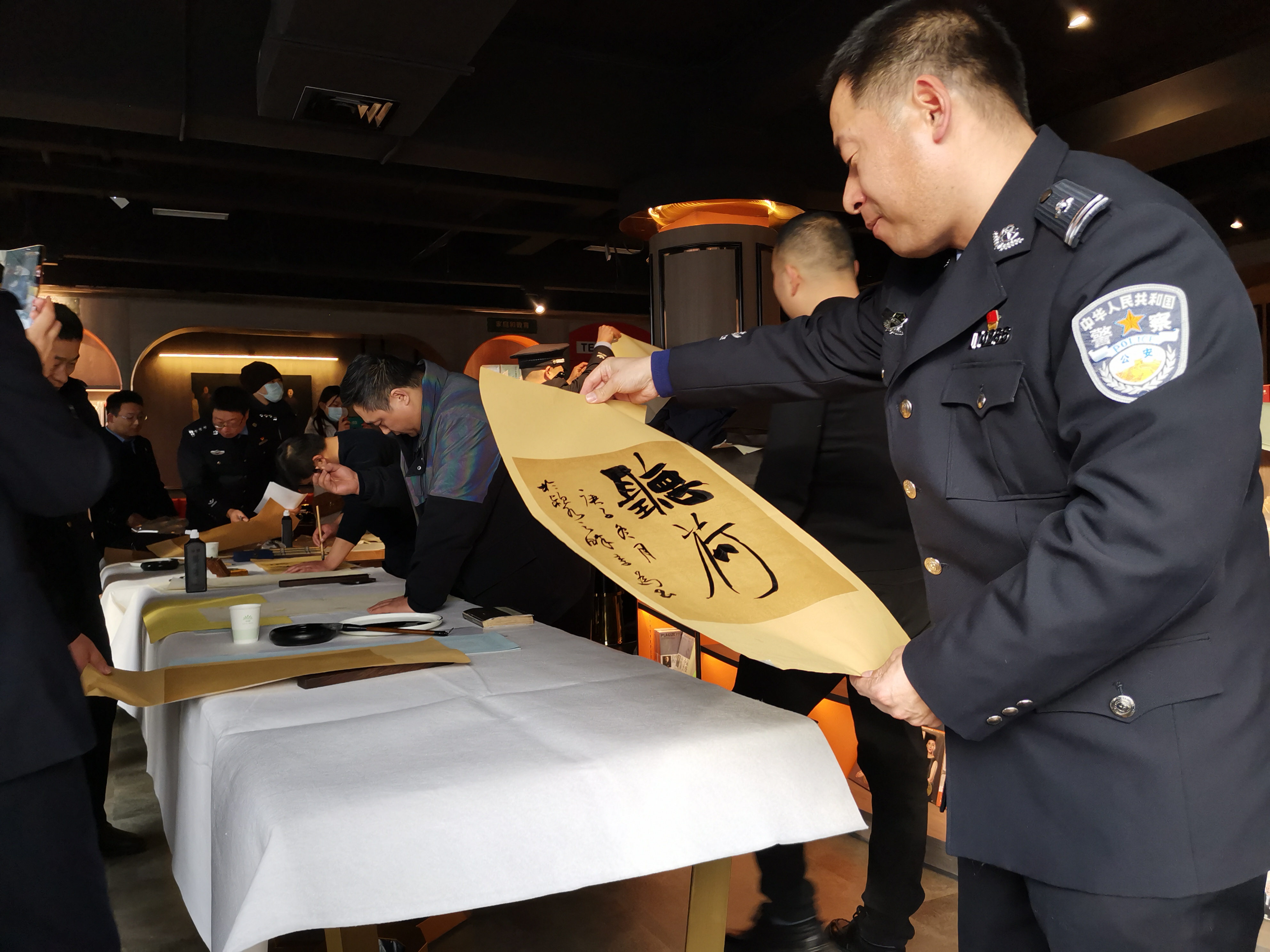 活動現場,氣氛熱烈,書法家們現場揮毫潑墨、筆走龍蛇,帶著喜迎牛年的美好祝愿。民警、輔警爭相圍觀,觀看、揣摩書法家們蒼勁有力的書法作品,房間內洋溢著濃郁的節日氣息。