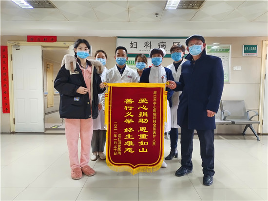 “劉醫生,謝謝您!”1月30日上午,在周口市中心醫院婦科病區,做完胚胎橫紋肌肉瘤手術的小雨(化名)向醫護人員送上“愛心捐助 恩重如山 善行義舉 終身難忘”的錦旗。