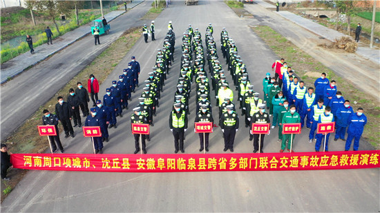 為進一步健全完善涉及危險品運輸車事故應急處置和搶險救援機制,加強省際國省道安全管控,提高突發事件應急處置和救援能力,經共同研究決定,3月3日上午,河南省公安廳交警總隊組織周口市公安局交通管理支隊和安徽阜陽市公安局交通管理支隊聯合兩地交警、環保、消防、施救、120急救中心等多部門在兩市交界處舉行道路交通事故應急救援聯合演練,演練內容包括接處警、交通管制、環境監測、營救被困人員、處置危化品、事故現場勘察、事故現場清理等內容。