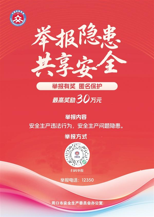 周口市安全生產委員會辦公室以舉報電話、掃碼舉報等方式,受理群眾舉報安全生產非法違法行為線索。一經查實,我們將依據《河南省安全生產領域舉報獎勵實施辦法》相關規定,對舉報人予以獎勵,最高獎勵金額30萬元。我們將對舉報人個人信息進行嚴格保密,依法保護舉報人的合法權益。