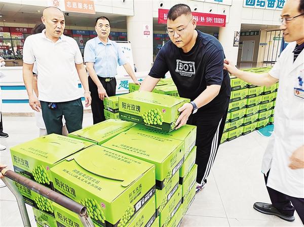 9月7日下午,來(lái)自黃泛區(qū)農(nóng)場(chǎng)的時(shí)先生(右二)將270箱自家農(nóng)場(chǎng)種植的葡萄捐贈(zèng)給周口港區(qū)醫(yī)院,與醫(yī)護(hù)人員一起分享雙重喜悅:自家果園的豐收和他個(gè)人的身體康復(fù)。