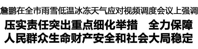本報訊 (記者 李鳳霞) 1月18日,市長詹鵬主持召開全市雨雪低溫冰凍天氣應對視頻調(diào)度會議,強調(diào)要深入學習貫徹習近平總書記關于防災減災救災的重要指示精神,貫徹落實省委和市委決策部署,以“時時放心不下”的責任感,扎實有效應對雨雪低溫冰凍天氣,確保人民群眾生命財產(chǎn)安全和社會大局和諧穩(wěn)定。孔陽、朱向陽、張建黨、程若光、王文峰出席會議。