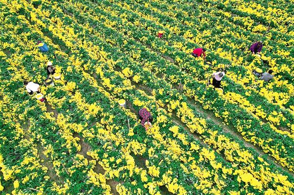 11月13日,項城市新橋鎮南趙村村民在田間采摘金絲皇菊。剛剛離枝的新鮮菊花隨即被送往村里的加工車間烘干,之后由專業合作社統一收購并對外銷售。