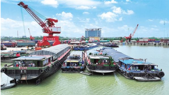 清晨的沙潁河畔,周口港范營作業區一派繁忙景象。巍然聳立的橋吊如鋼鐵巨臂,精準地將五顏六色的集裝箱吊裝至貨輪;